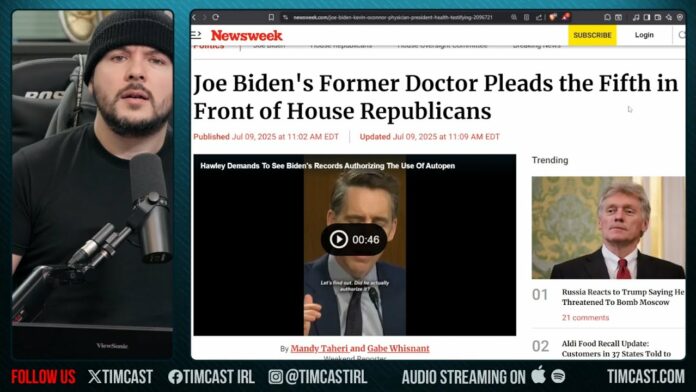 news1todaysnewsW1winner Biden Doctor PLEADS THE FIFTH, Refuses To Testify To Congress, Biden Pardons ARE VOID | Tim Pool By The Patriots Brief - July 10, 2025 1 1468 FacebookTwitterPinterestWhatsApp IMAGE ABOVE FROM VIDEO BELOW TOP COMMENTS FROM VIDEO BELOW Dr. Jill should be charged with elder abuse! His doctor cited the 5th and not doctor patient privilege thats odd